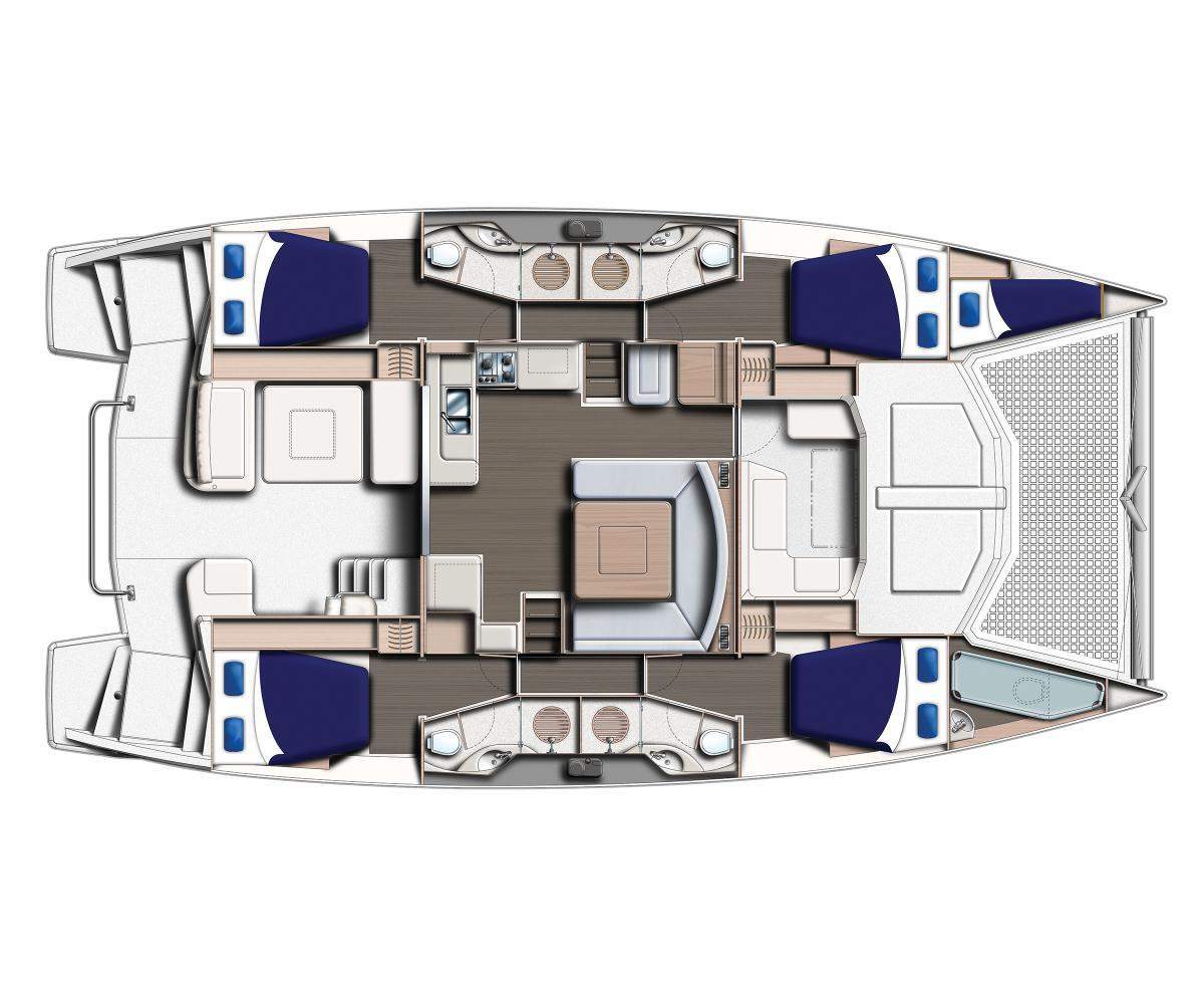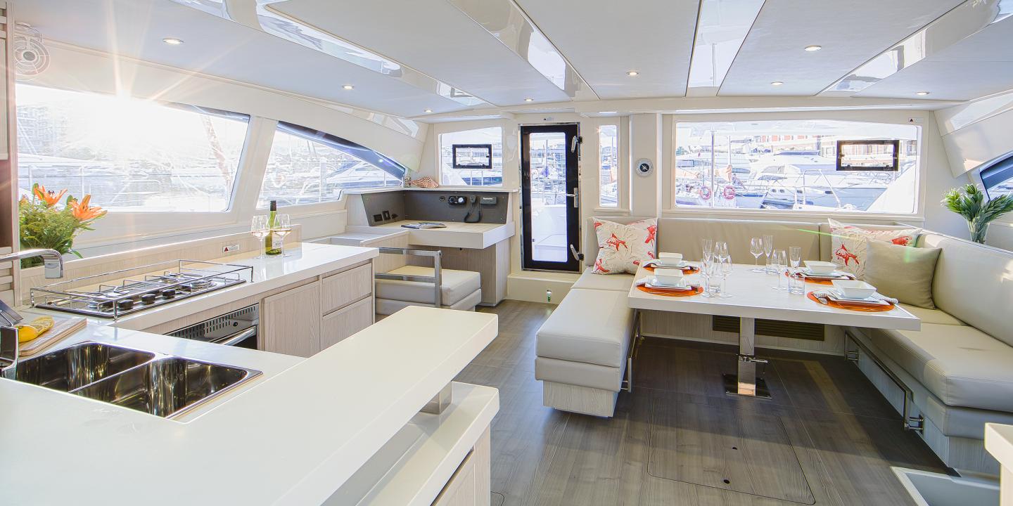 The 4800 catamarans are true blue-water cruisers featuring a self-stacking mainsail with integral sail cover, roller-furling genoa, and twin 55 hp diesel engines. An electric windlass with handheld remote makes anchoring easy. The raised helm station is at the forward end of the spacious cockpit and above the cockpit’s hardtop roof, providing 360 degrees of visibility. A hardtop bimini shades the helm. The cockpit has walk-through access to the swim platforms, a full electronics package that includes a color chart-plotter and autopilot, stereo/MP3player speakers, a large table, and lots of seating. A wide door opens to the luxurious saloon.